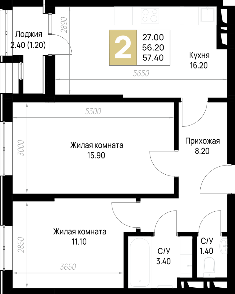 Общая площадь: 57.40м2