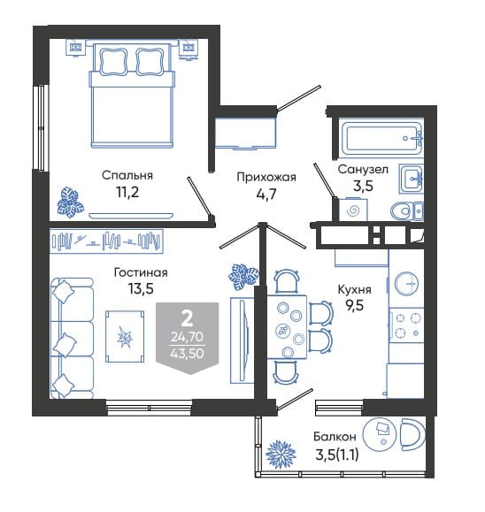 Общая площадь: 43.50м2