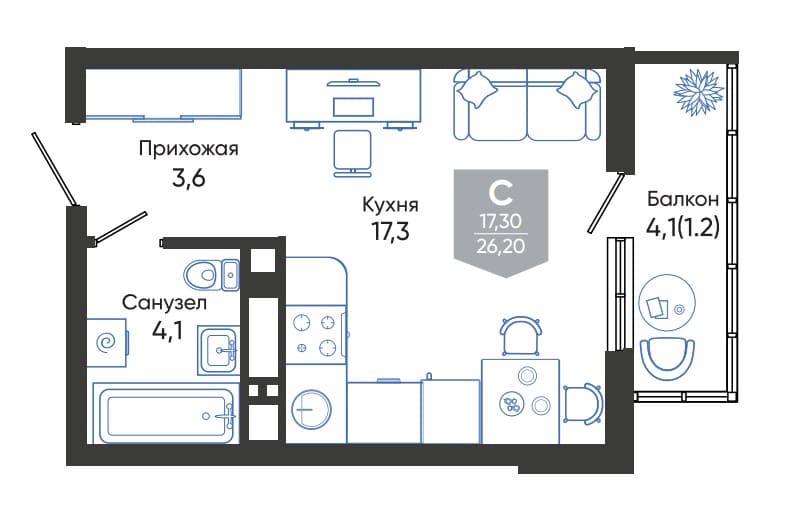 Общая площадь: 26.20м2