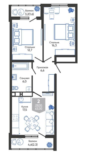 Общая площадь: 63.00м2