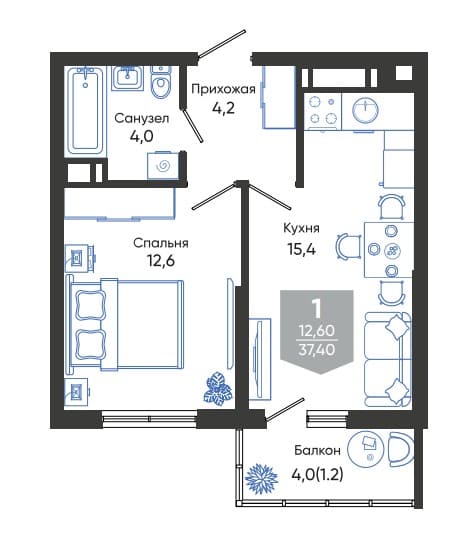 Общая площадь: 37.4м2