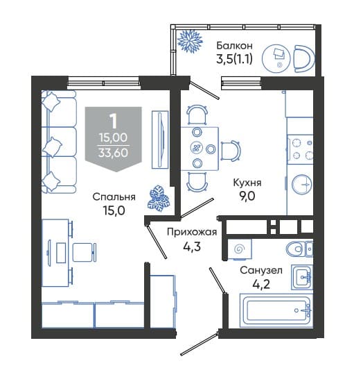 Общая площадь: 33.60м2