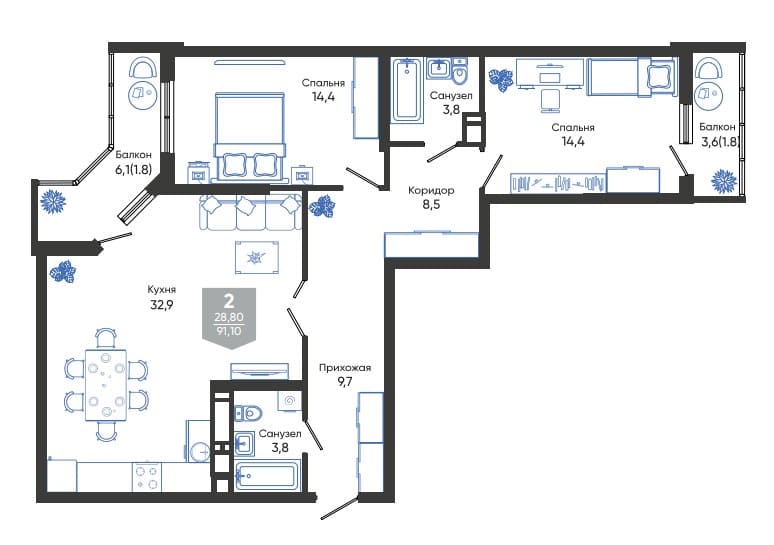 Общая площадь: 91.10м2