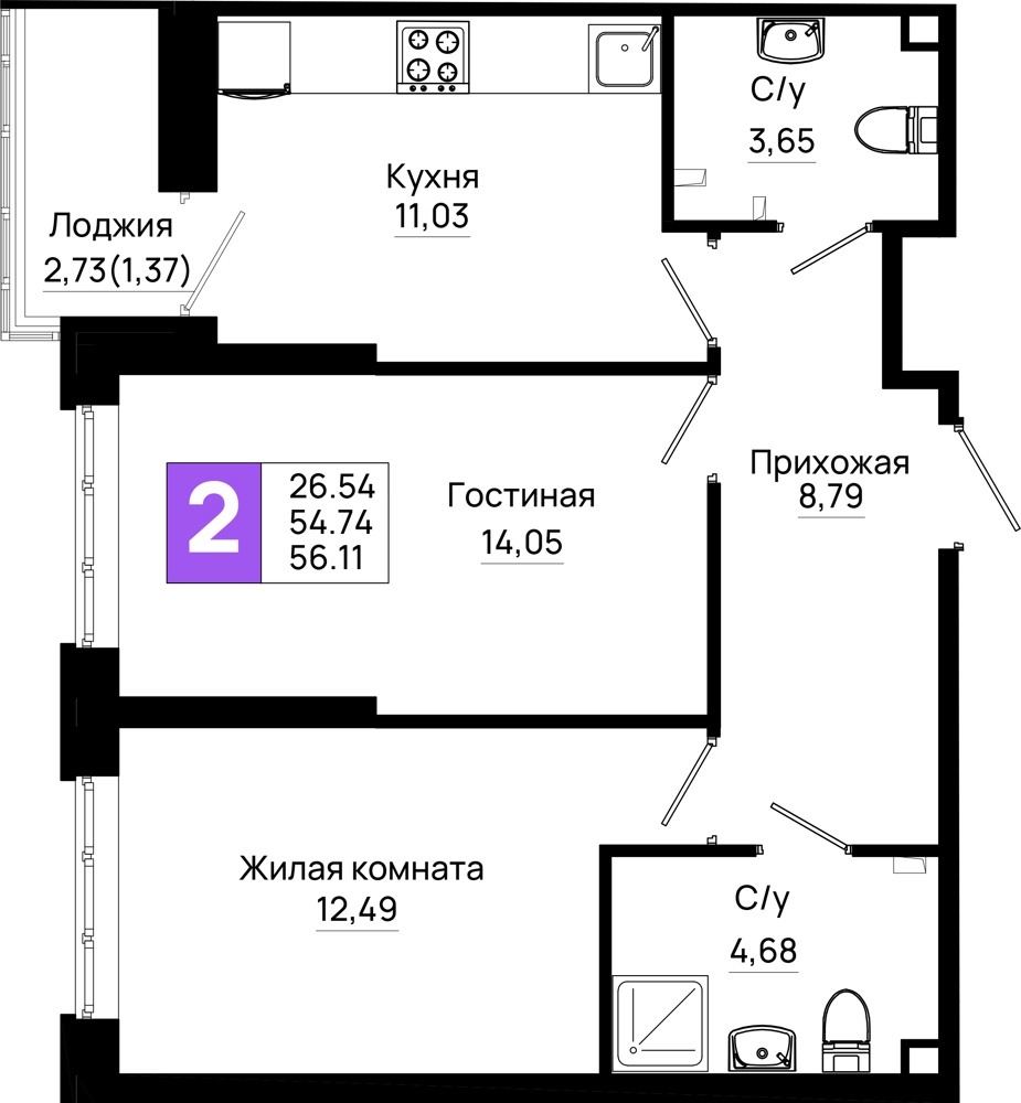Общая площадь: 56.11м2