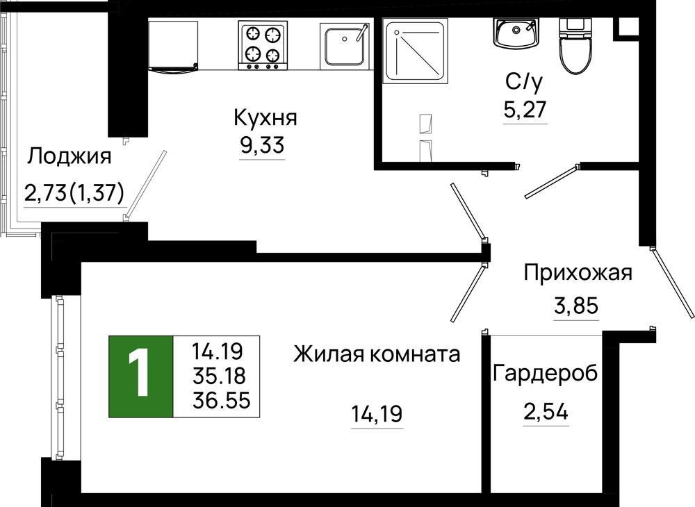 Общая площадь: 36.55м2