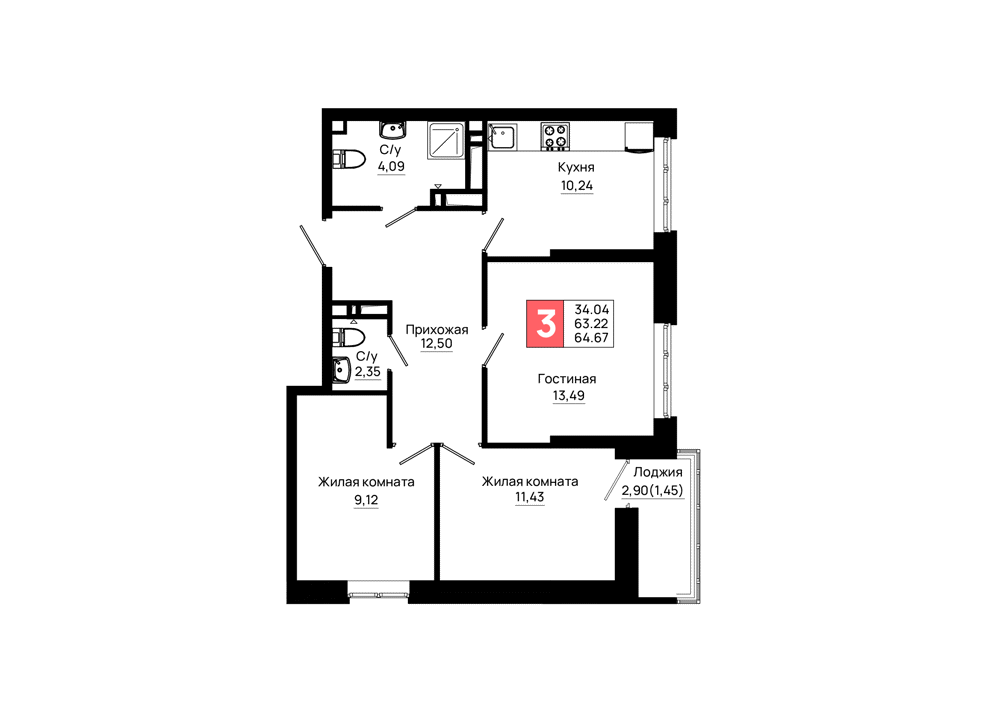 Квартира этаж 3, площадь 64.67 м2