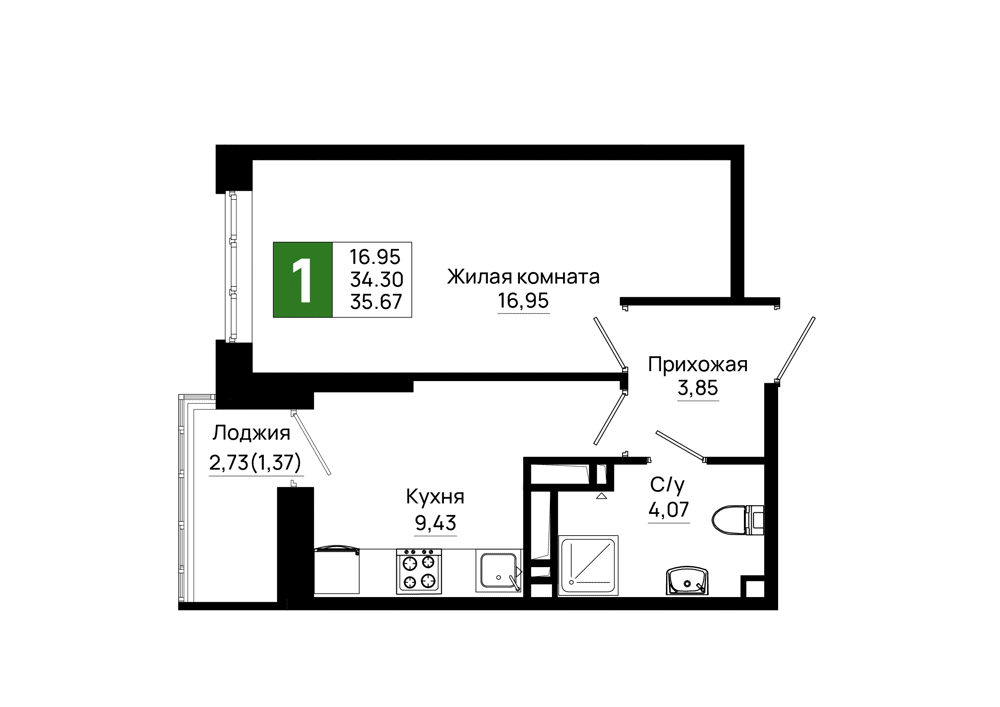Квартира этаж 9, площадь 35.67 м2