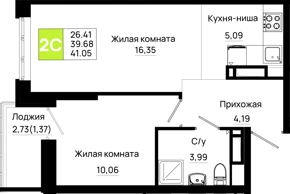 Общая площадь: 41.05м2