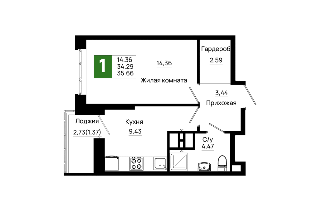 Общая площадь: 35.66м2