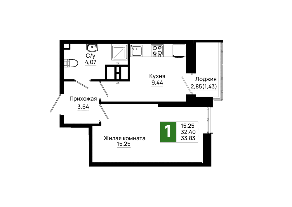 Общая площадь: 33.83м2
