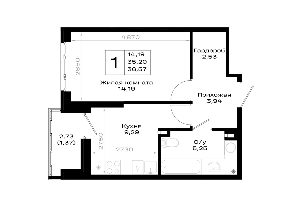 Общая площадь: 36.57м2