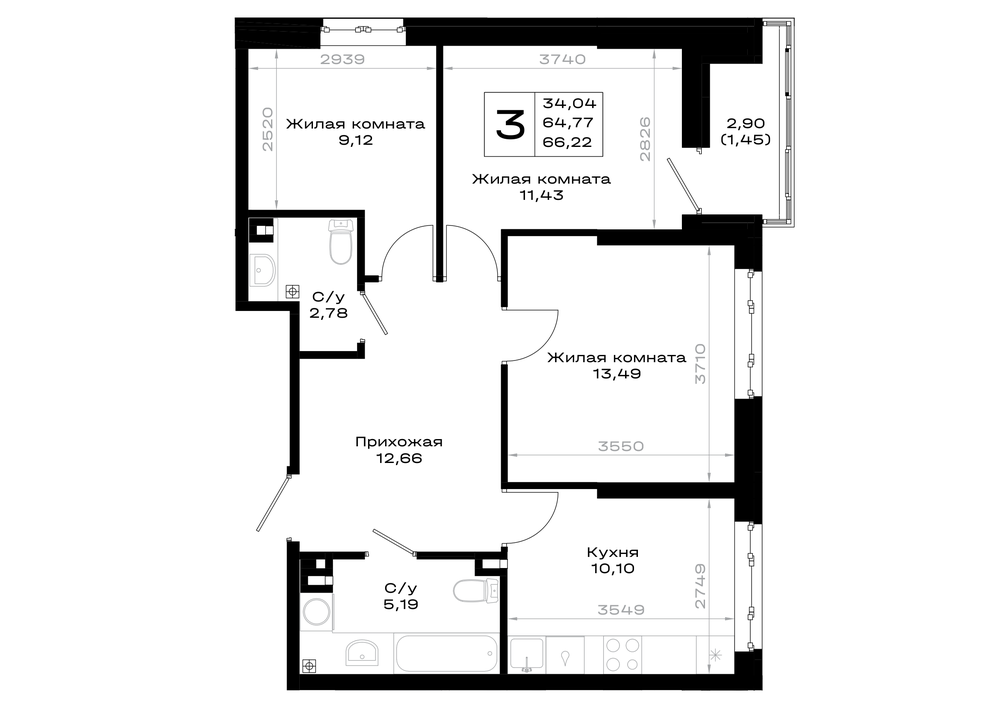 Общая площадь: 66.22м2