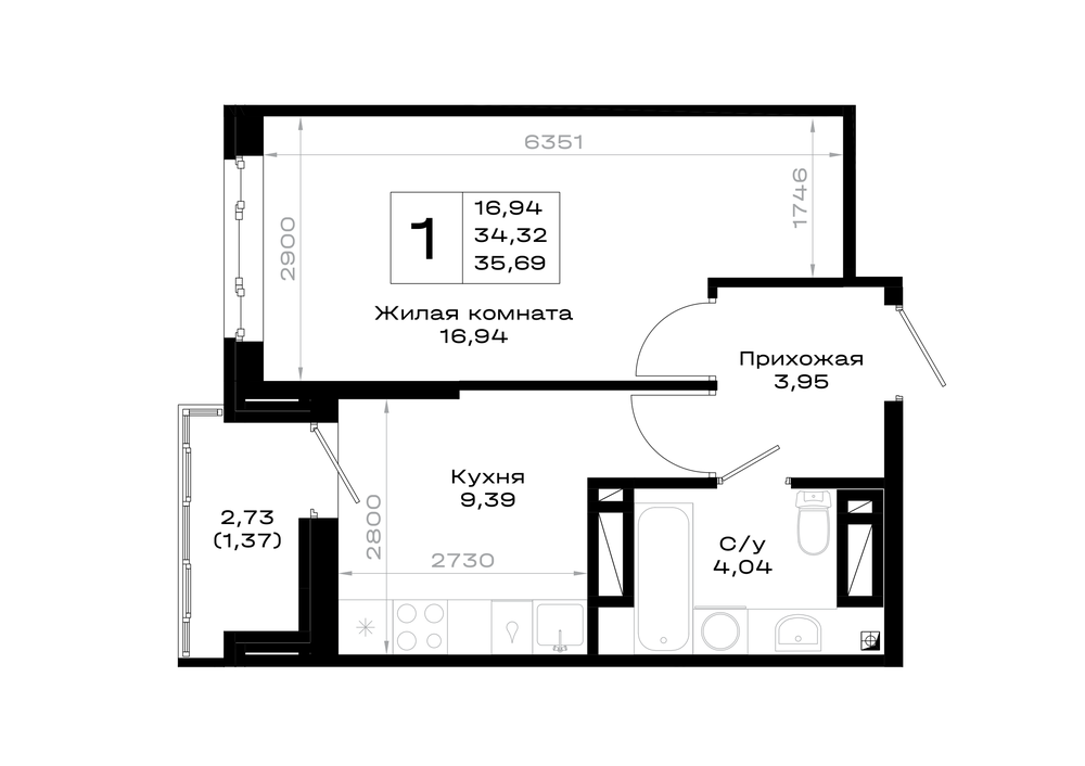 Общая площадь: 35.69м2