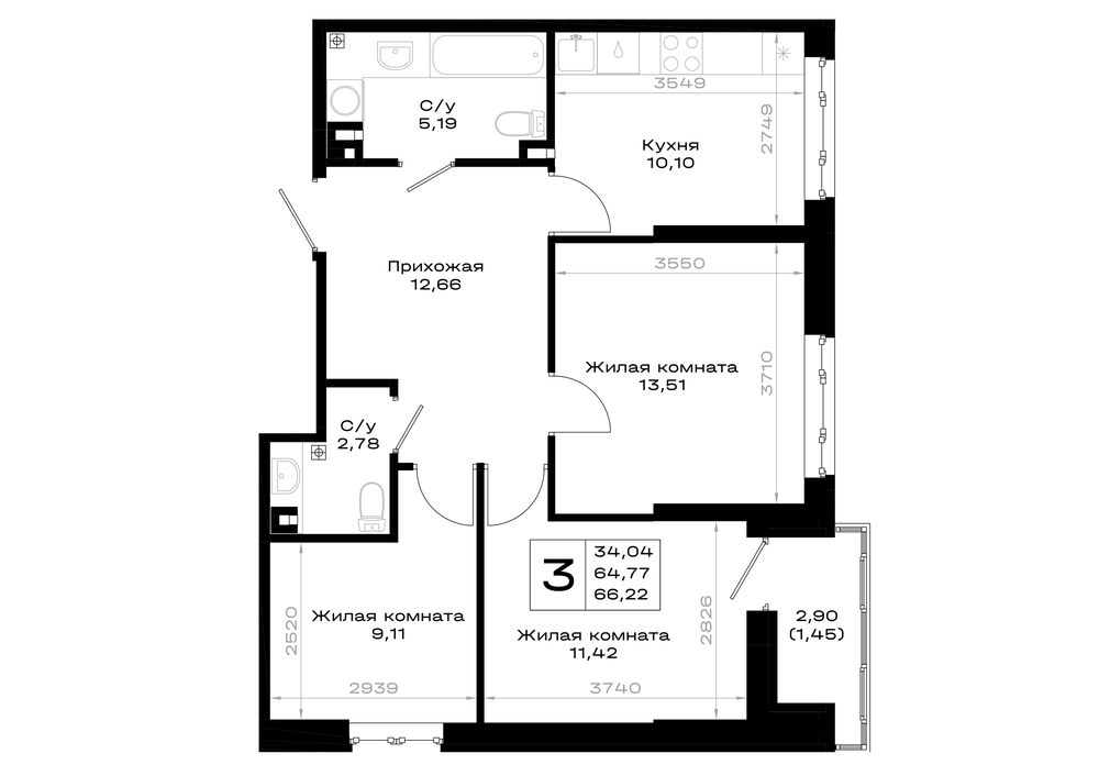 Общая площадь: 66.22м2
