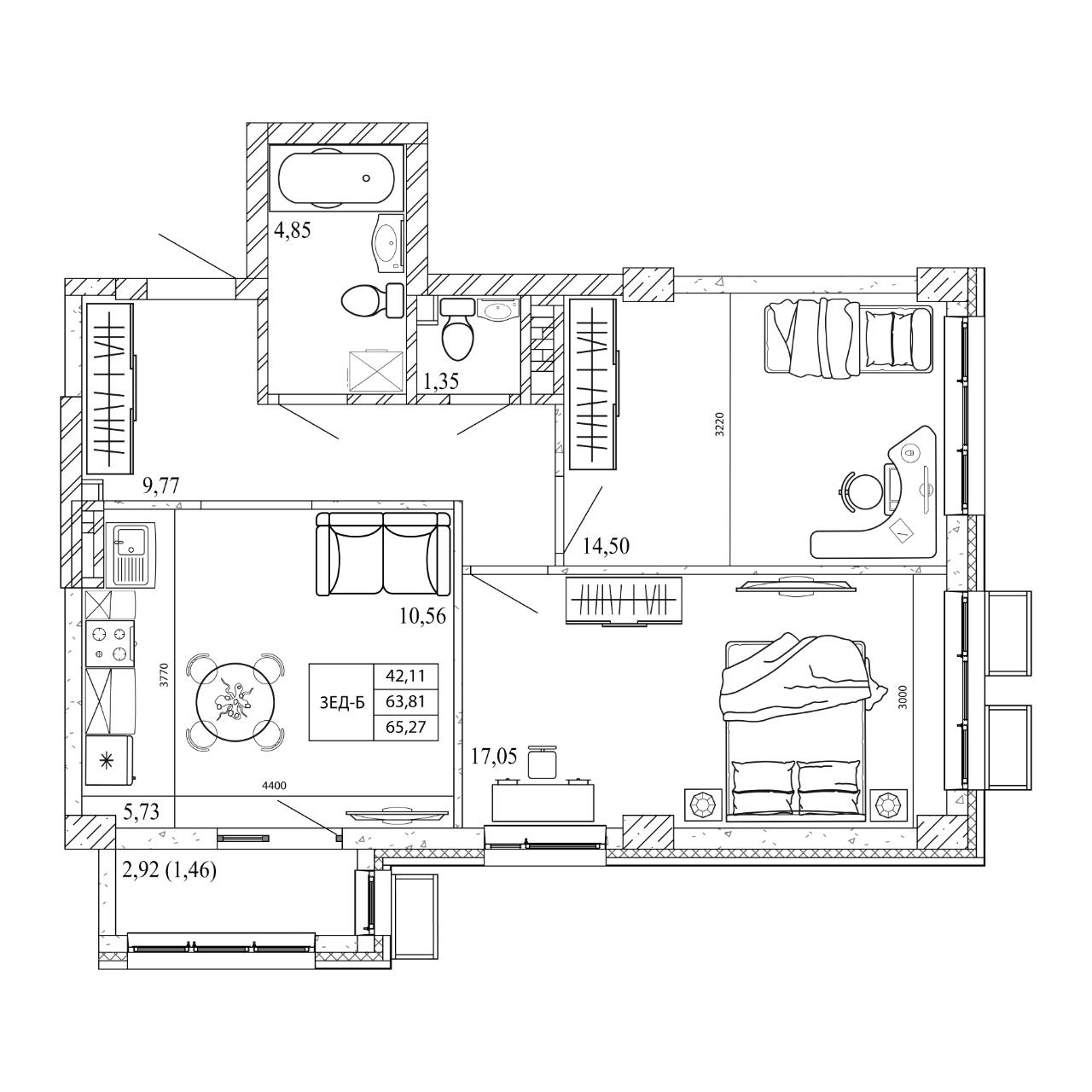 Общая площадь: 65.27м2