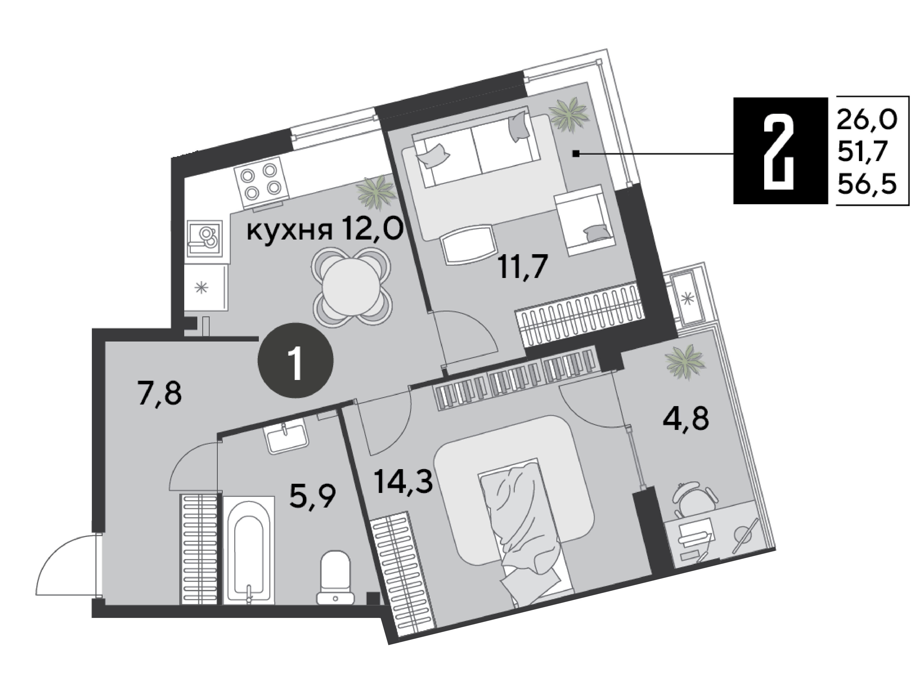 Общая площадь: 56.50м2