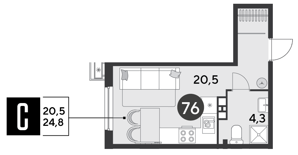 Общая площадь: 24.80м2