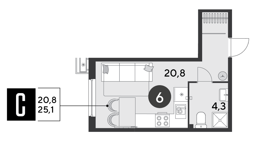 Квартира этаж 2, площадь 25.10 м2