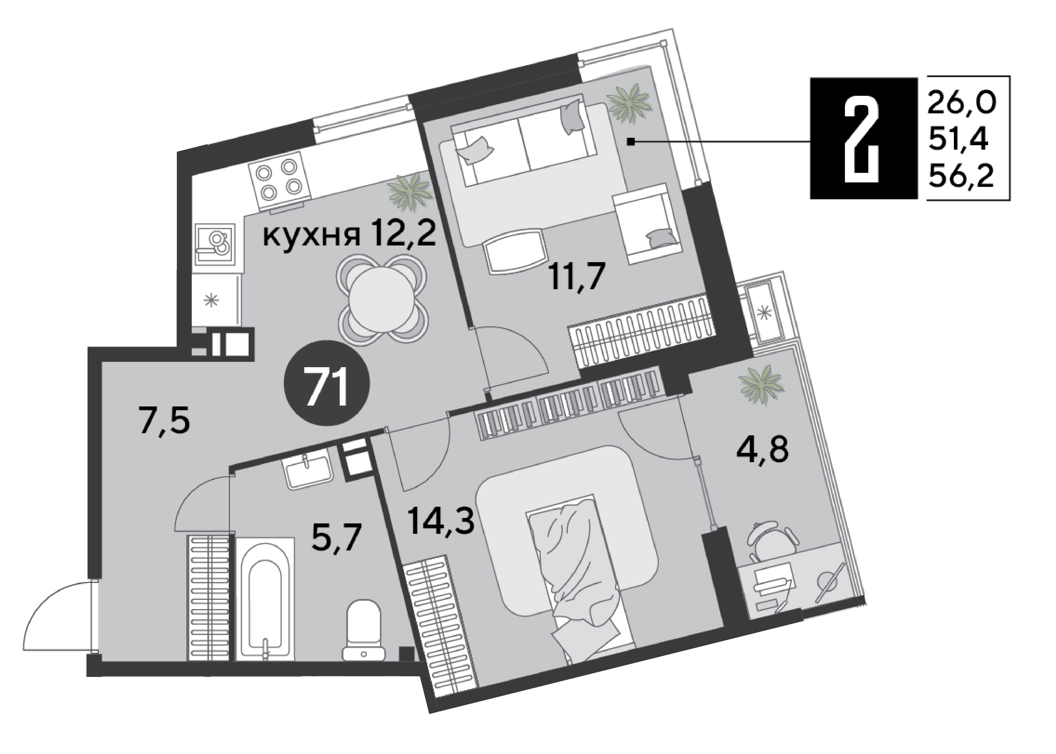 Квартира этаж 4, площадь 56.20 м2