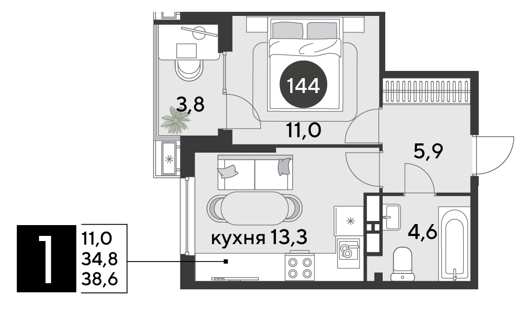 Квартира этаж 12, площадь 38.60 м2