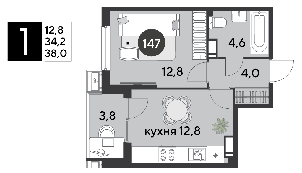 Квартира этаж 13, площадь 38.00 м2
