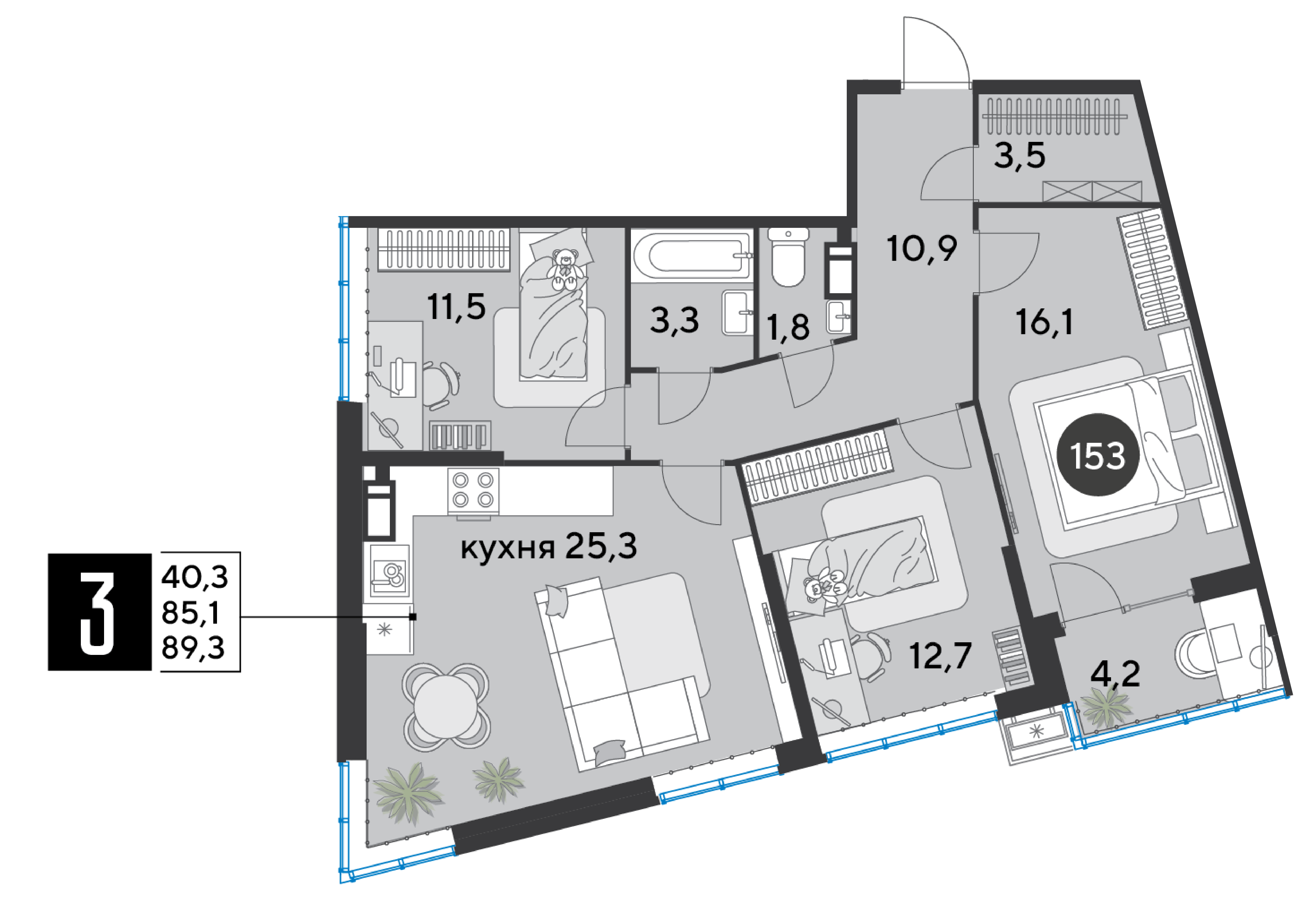 Квартира этаж 15, площадь 89.30 м2