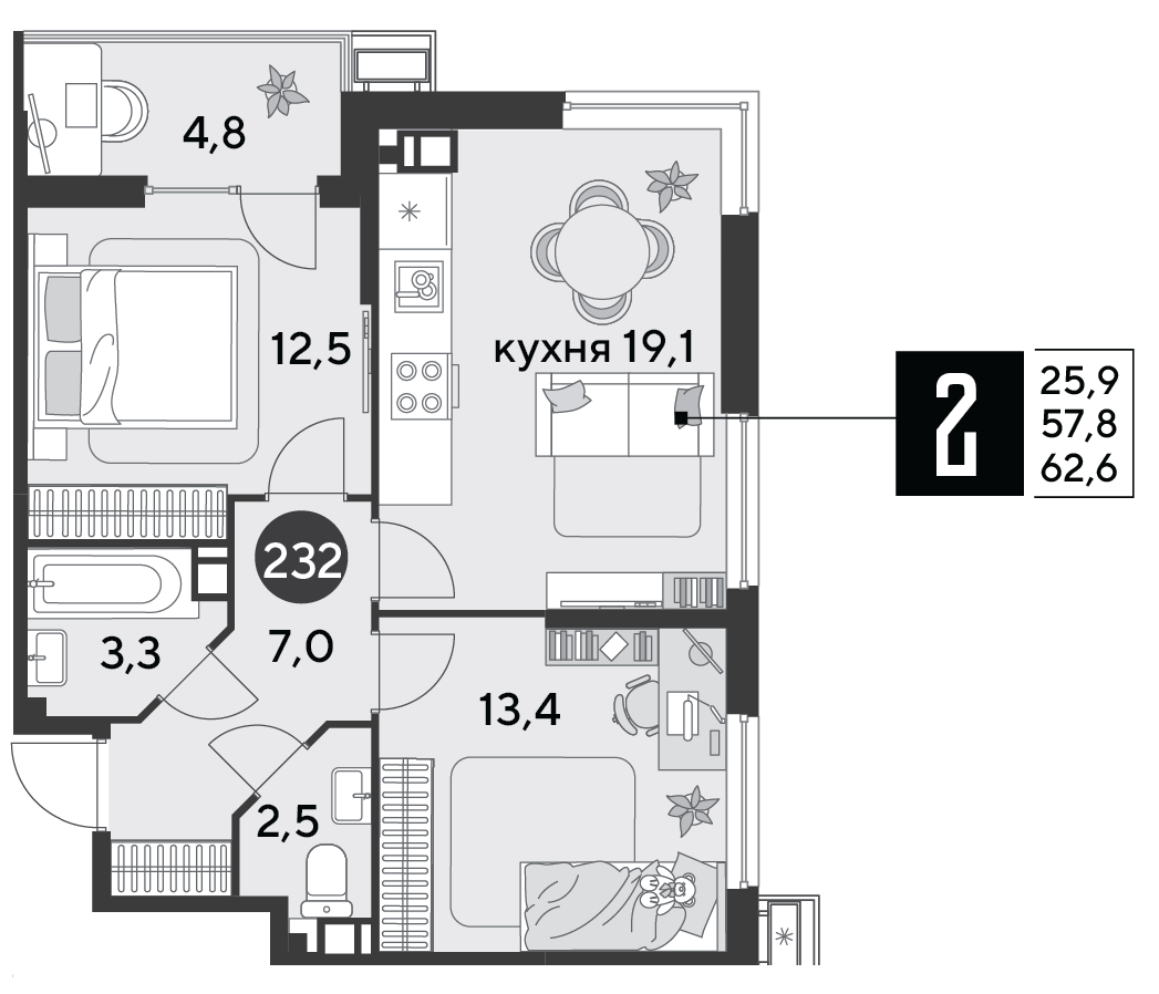 Квартира этаж 3, площадь 62.60 м2