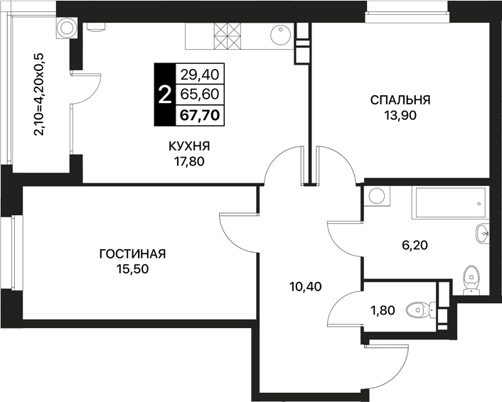 Общая площадь: 67.70м2