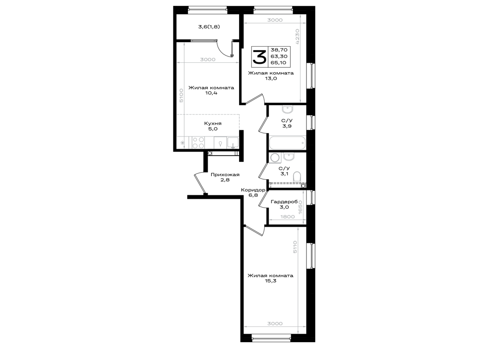 Общая площадь: 65.10м2