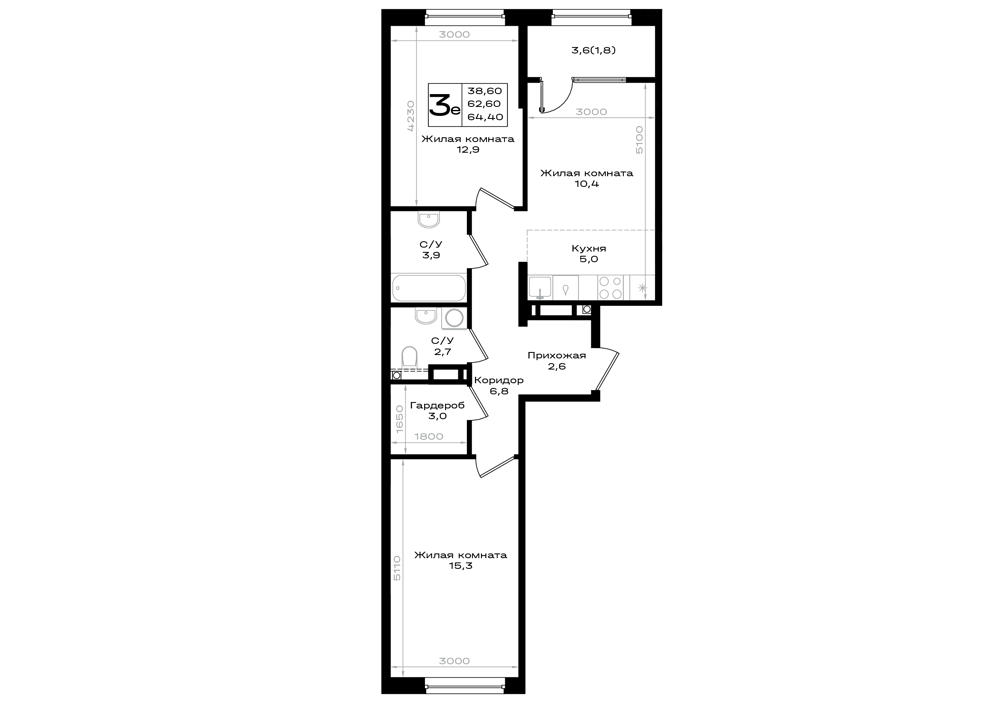 Общая площадь: 64.40м2