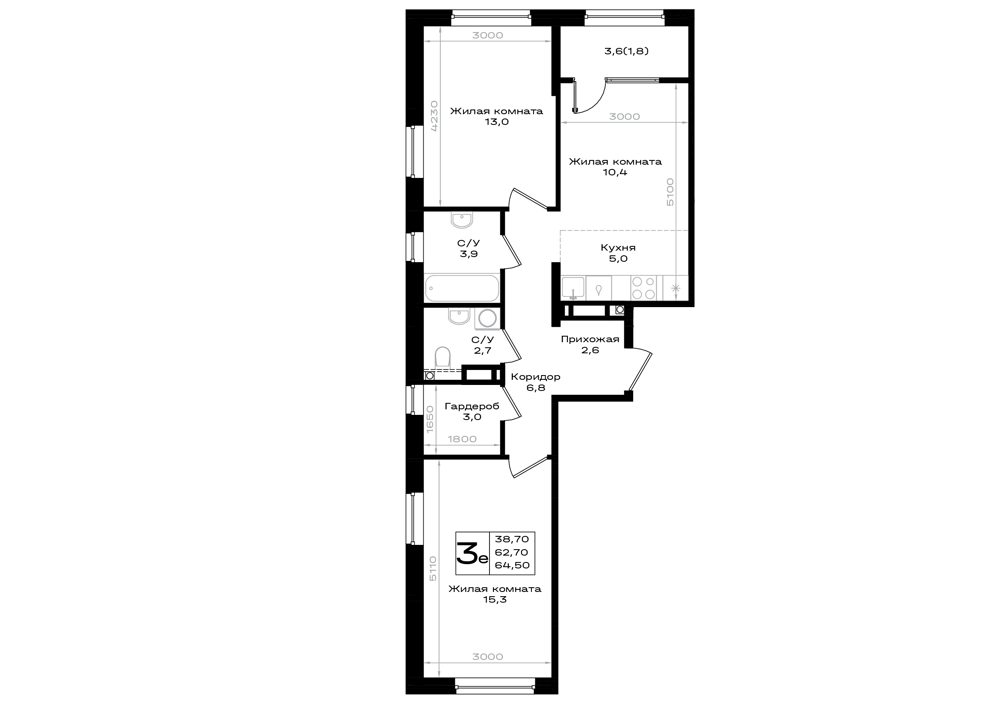 Общая площадь: 64.50м2