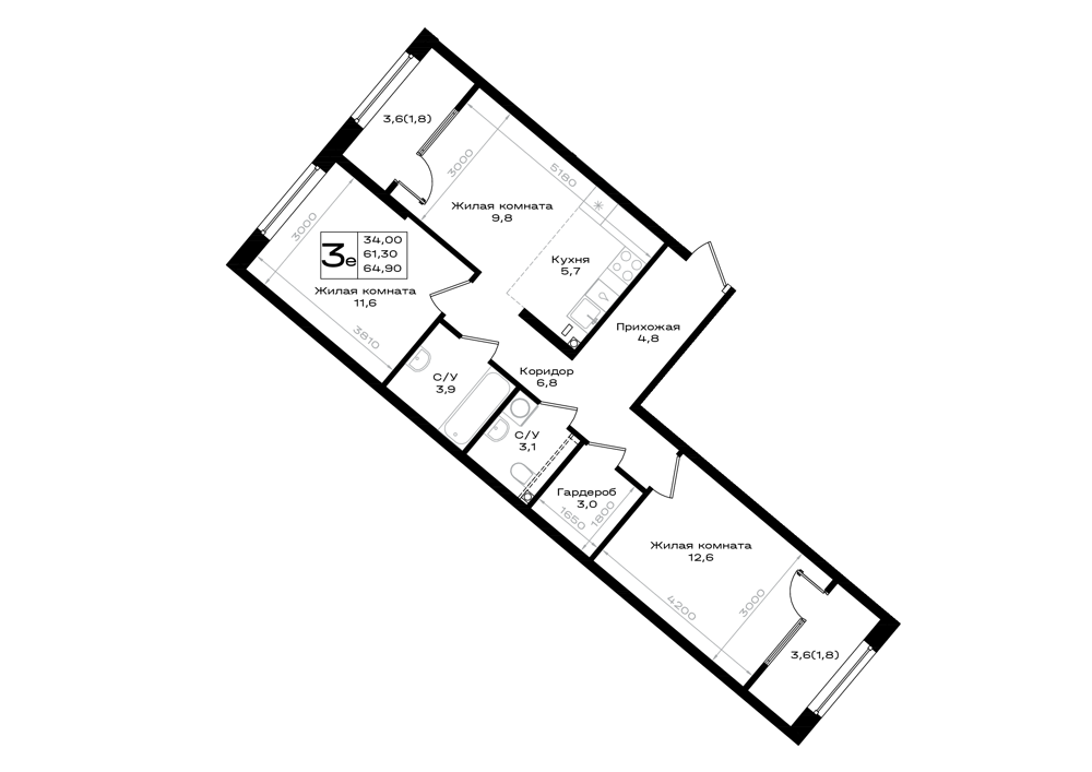 Общая площадь: 64.90м2