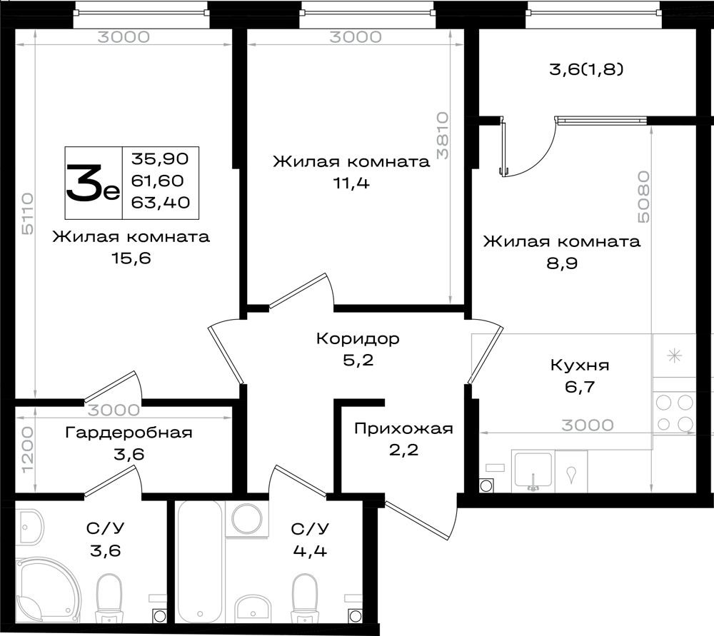 Общая площадь: 63.40м2