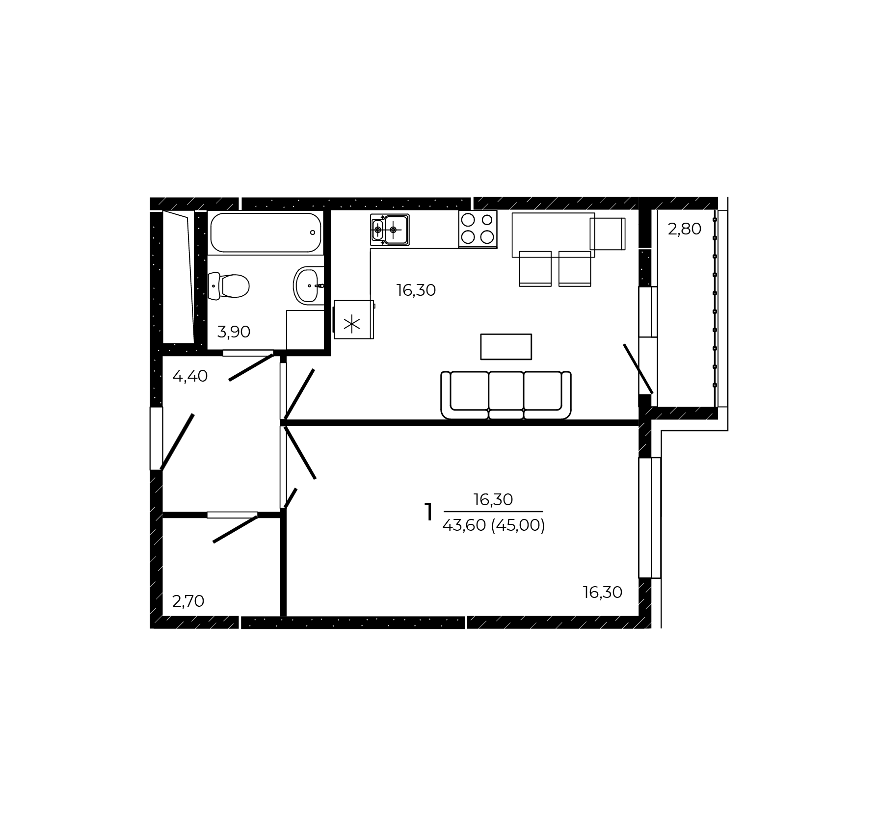 Общая площадь: 45.00м2