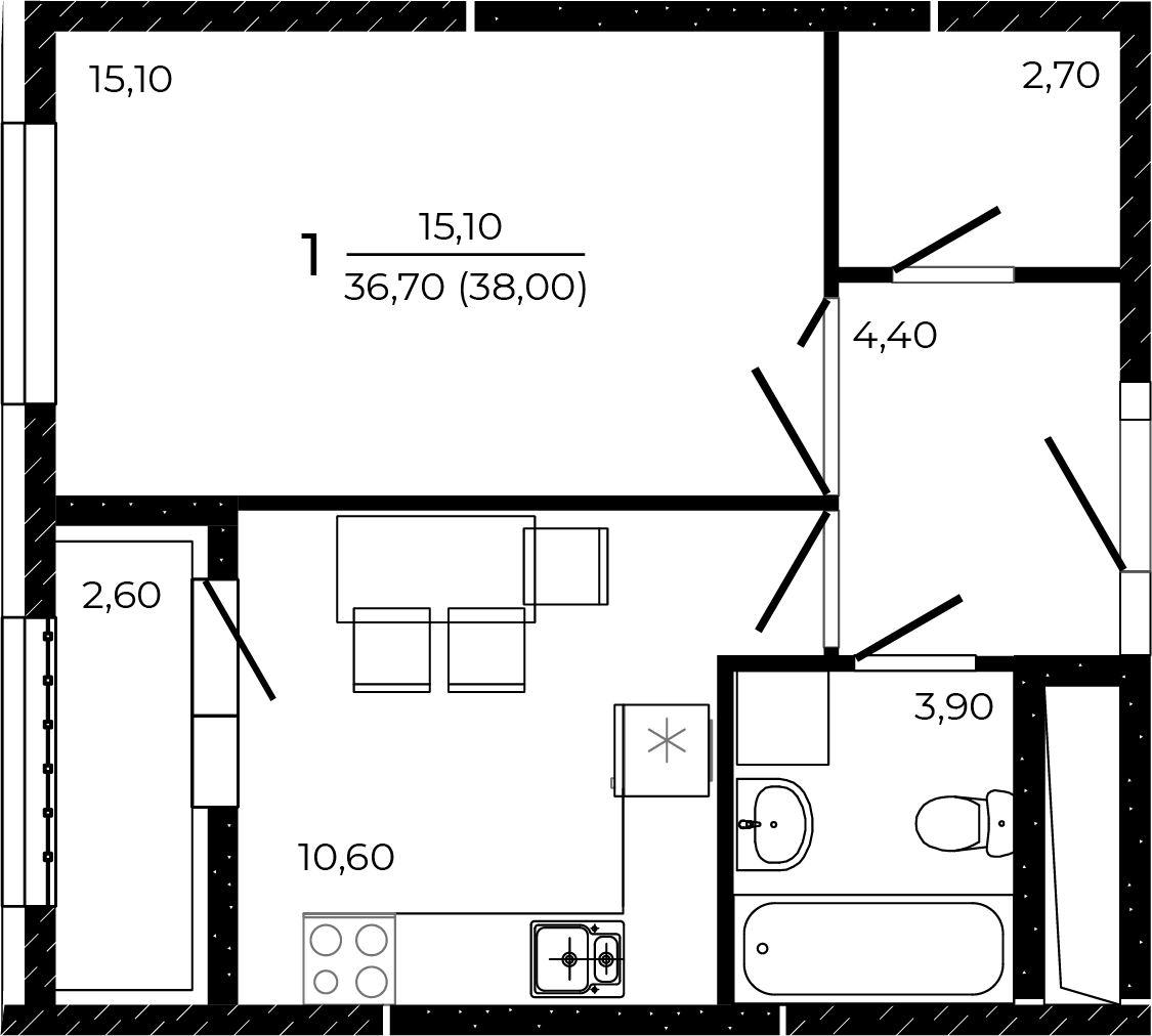 Общая площадь: 38.00м2