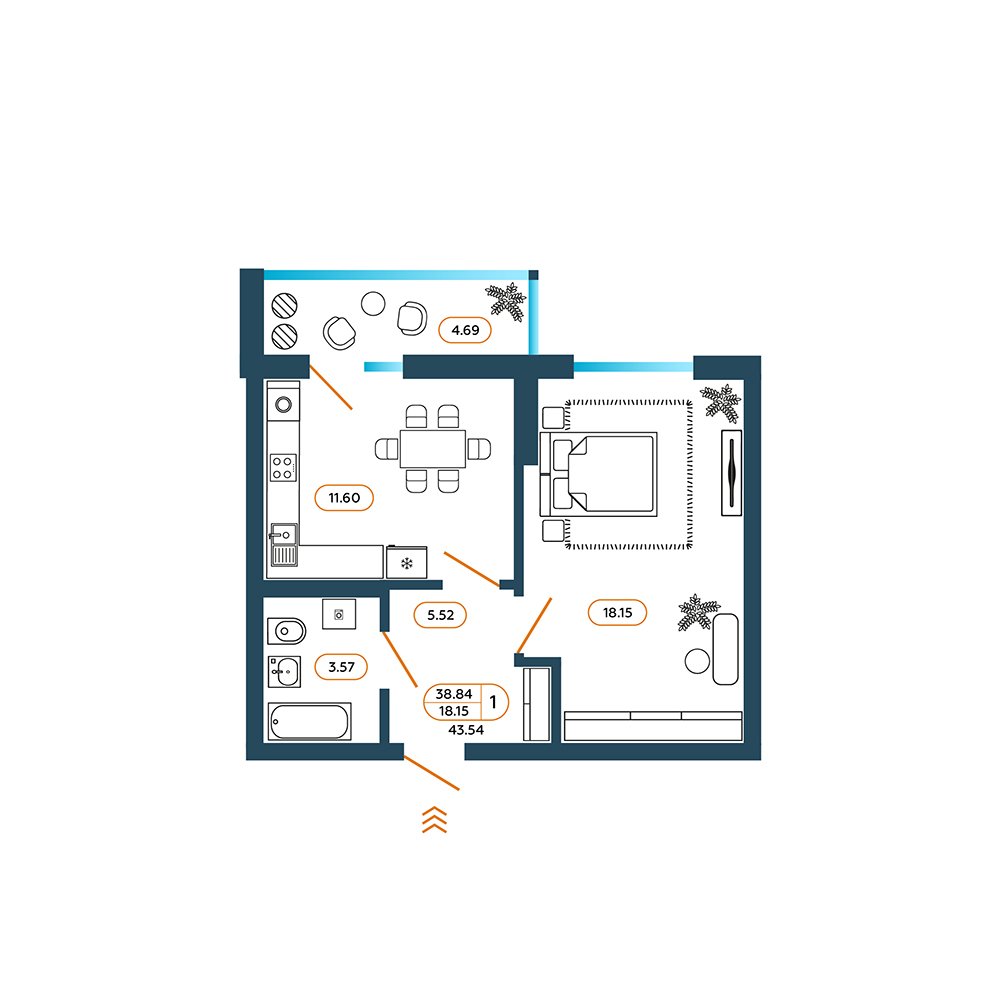 Общая площадь: 44.4м2