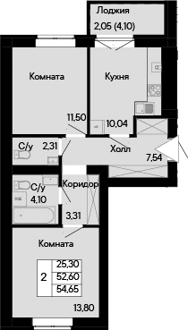 Общая площадь: 54.65м2
