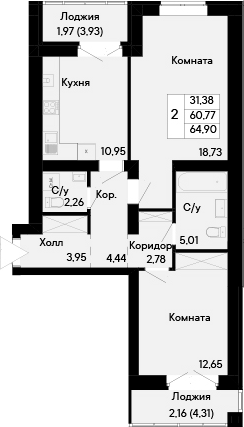 Квартира этаж 7, площадь 64.90 м2