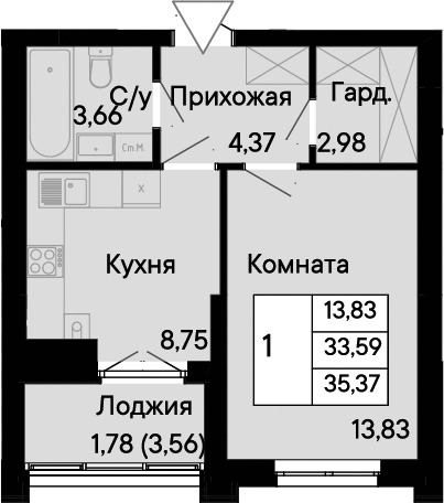 Общая площадь: 35.37м2