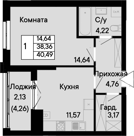 Общая площадь: 40.49м2