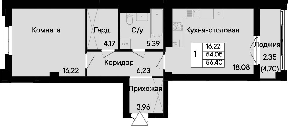 Общая площадь: 56.40м2