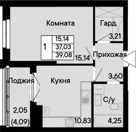 Общая площадь: 39.08м2
