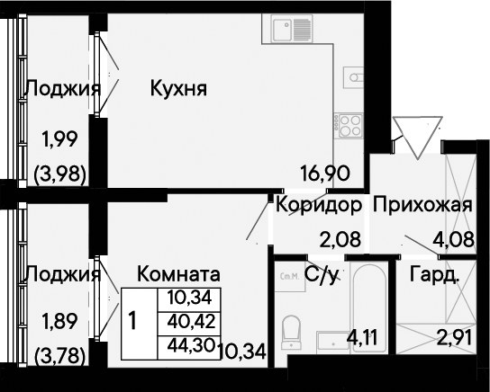 Общая площадь: 44.30м2