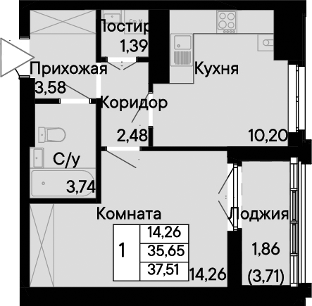 Общая площадь: 37.51м2