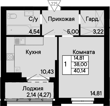 Общая площадь: 40.14м2
