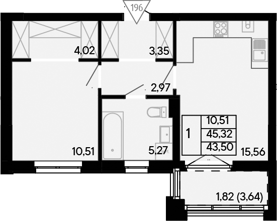 Квартира этаж 3, площадь 43.50 м2