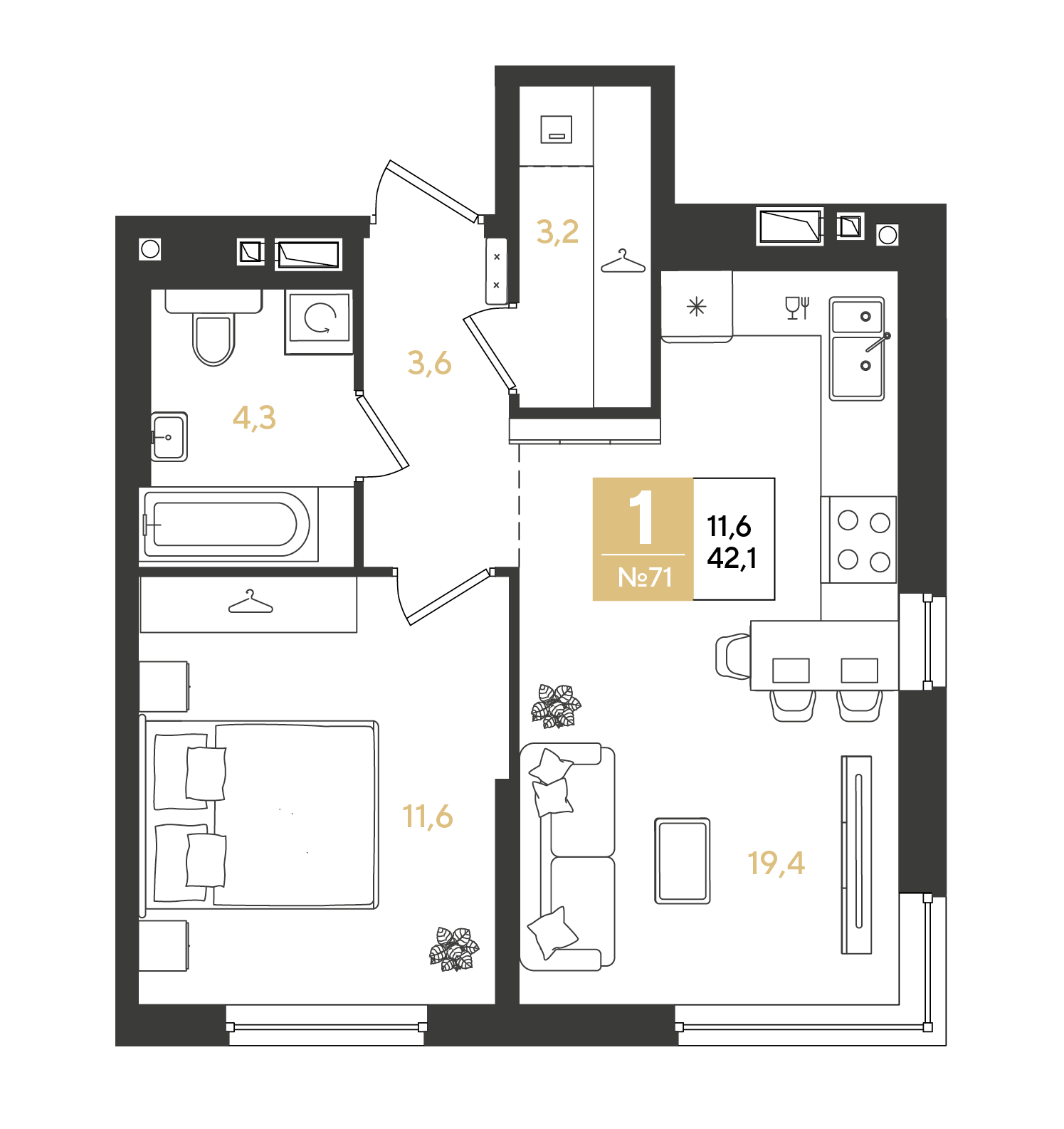Общая площадь: 42.10м2
