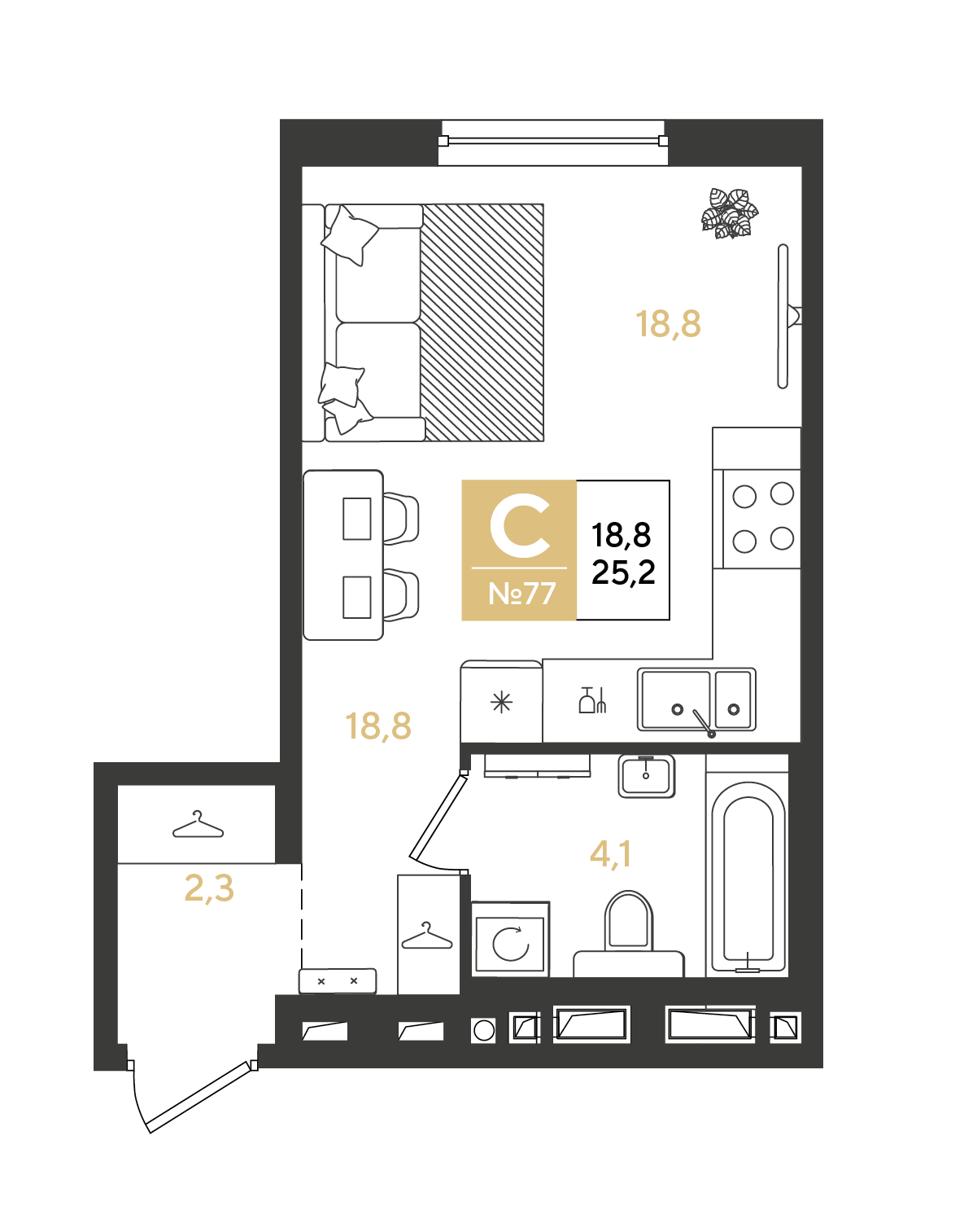 Квартира этаж 7, площадь 25.20 м2