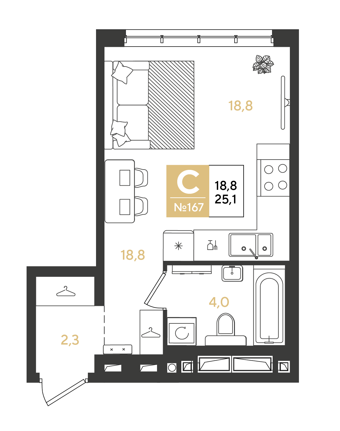 Квартира этаж 12, площадь 25.10 м2