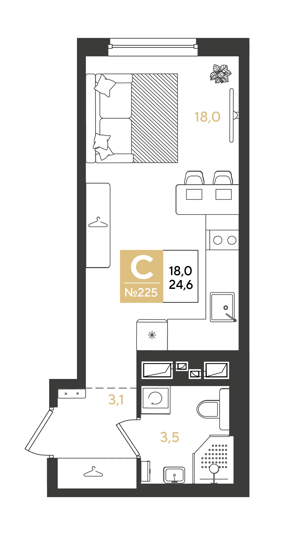 Квартира этаж 3, площадь 24.60 м2
